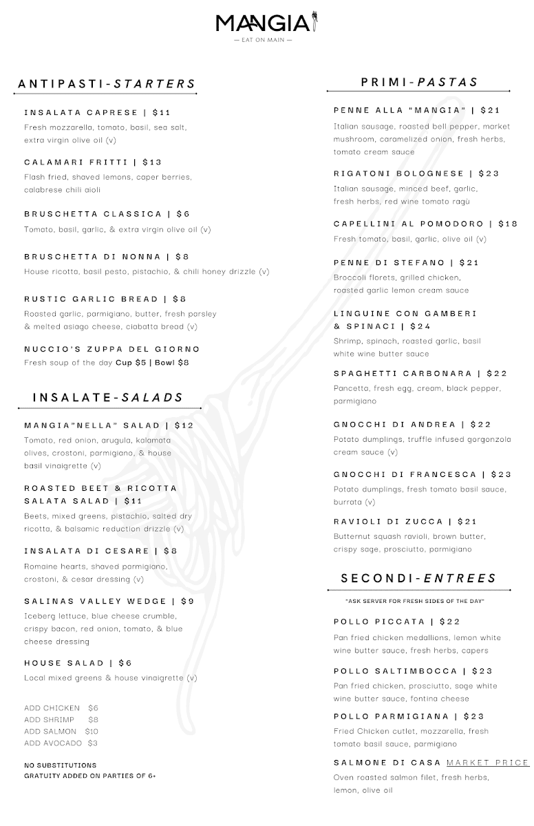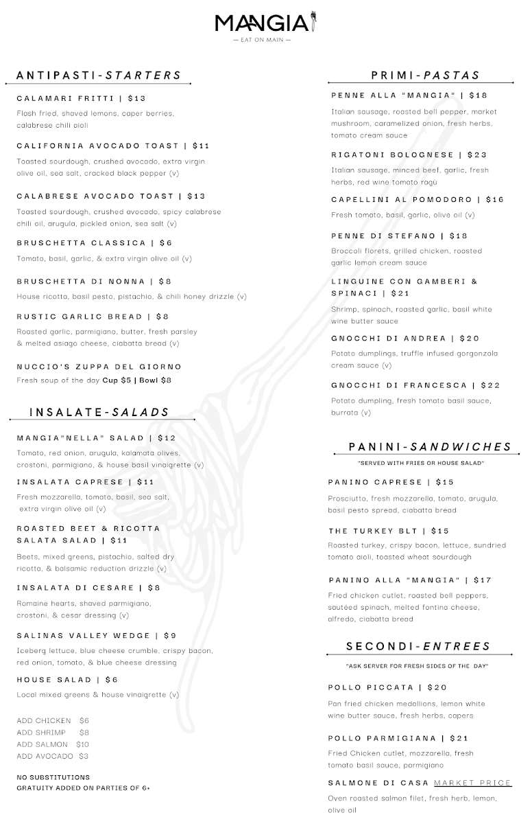 Mangia - Eat On Main, located at 328 Main St STE A in Salinas, CA, offers a diverse and inviting menu that caters to a wide range of tastes, from starters to desserts and everything in between. For those starting their meal with a light bite, the Bruschetta Classica, Bruschetta Di Nona, and Calabrese Avocado Toast are popular choices, providing a perfect balance of fresh, flavorful ingredients. For a more substantial start, Calamari Fritti or California Avocado Toast might be what you’re craving.
