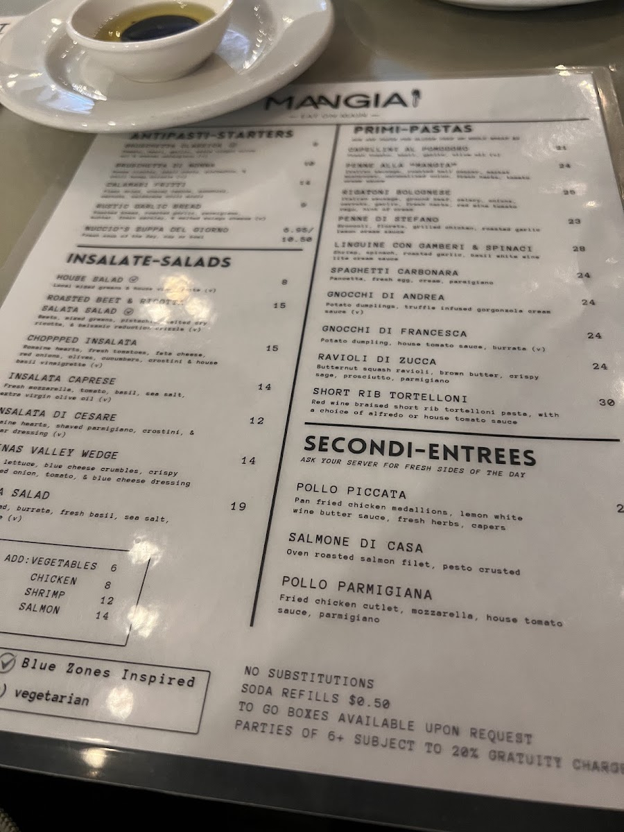 For those dining with family, Mangia’s family meal options include Spaghetti and Meatballs, Penne Alfredo with Grilled Chicken, and Gnocchi with Choice of Sauce, all served with sides like Caesar Salad or Garlic Bread.